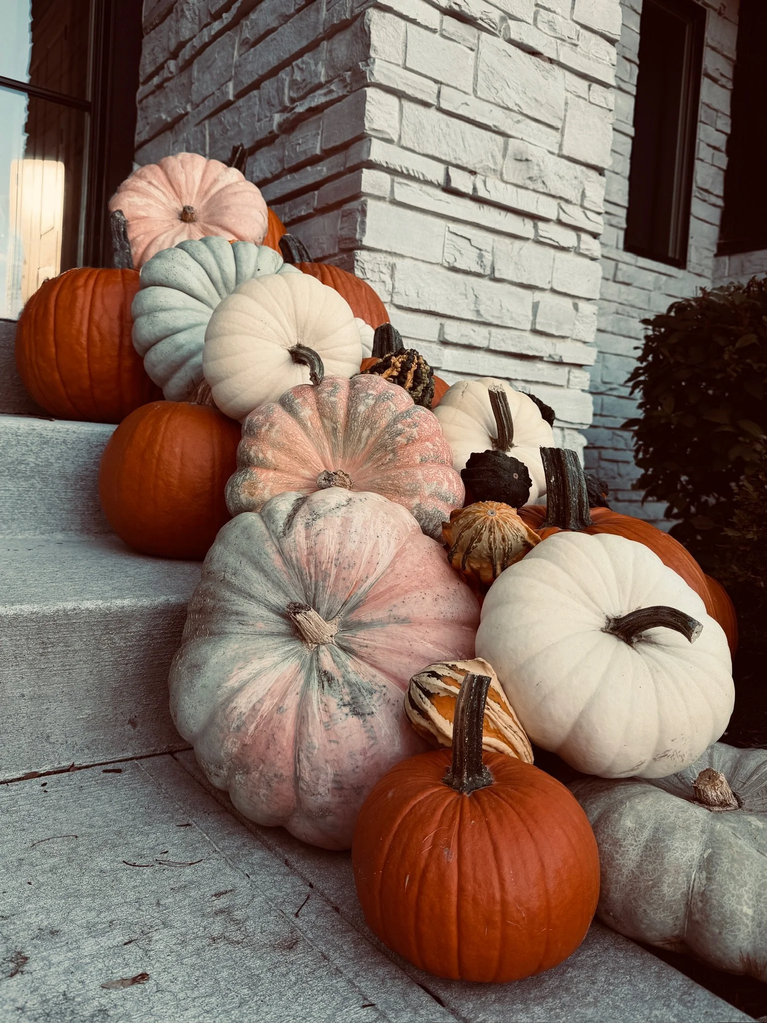 Simple, sweet, and welcoming — this smaller-scale setup brings cozy fall charm to any entryway. Featuring a mix of medium pumpkins, white ghosts, and a few standout specialty pieces, styled with natural texture and depth. Add a hay bale or mum for the finishing touch.